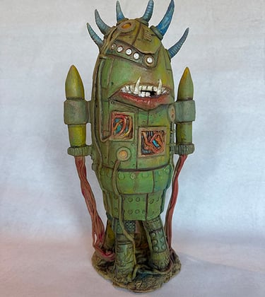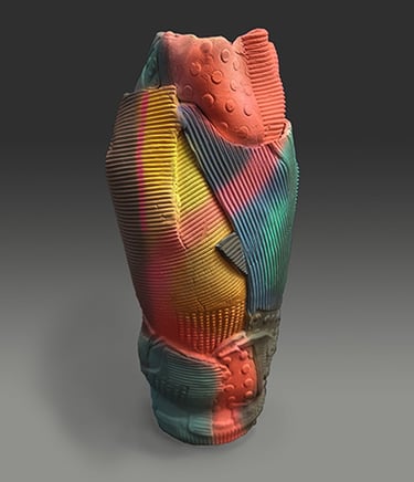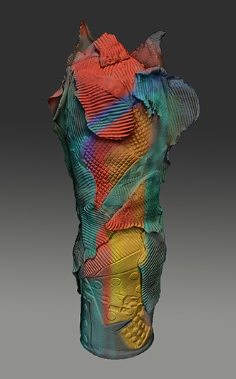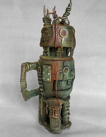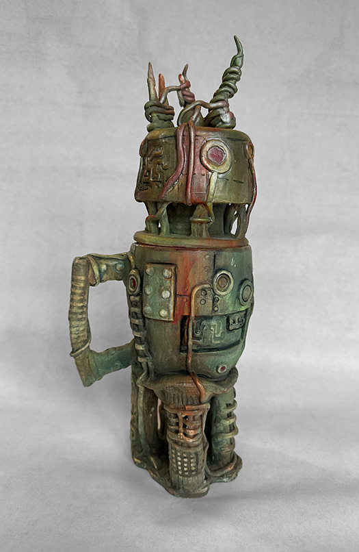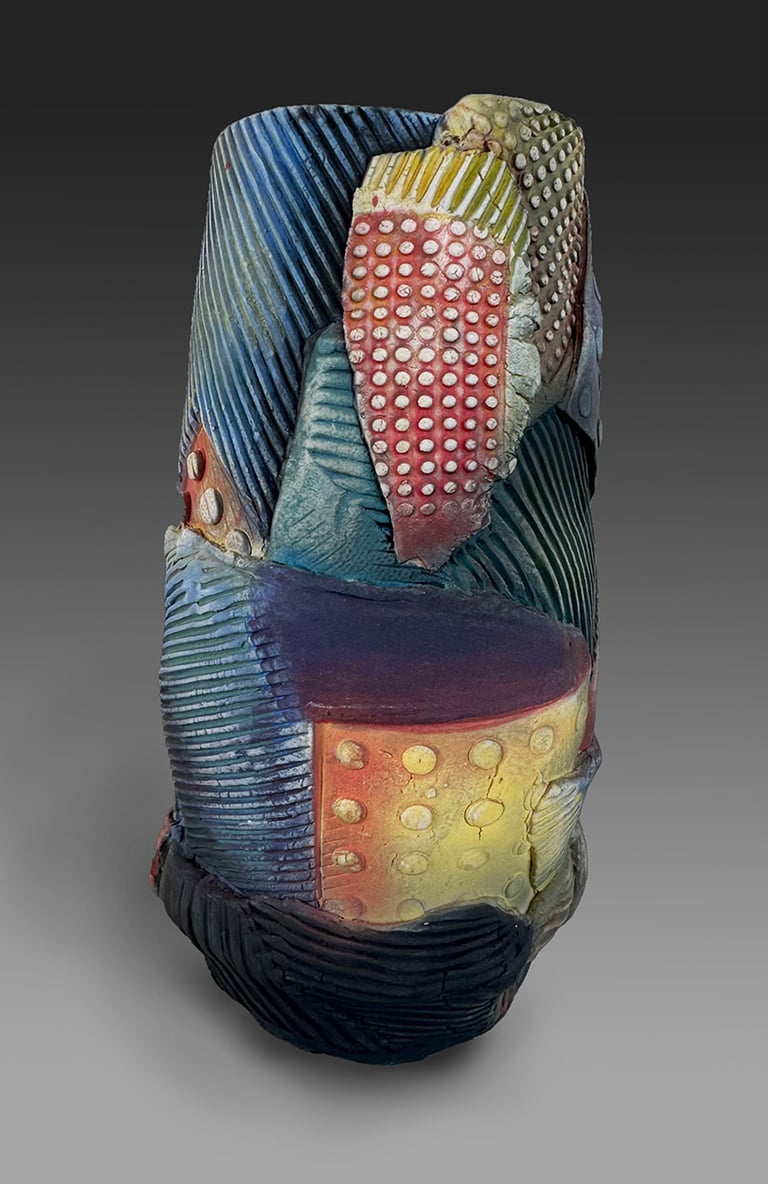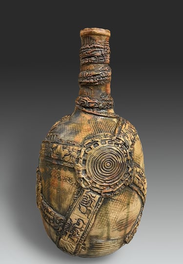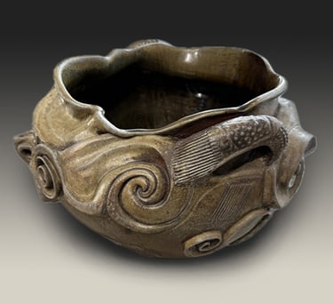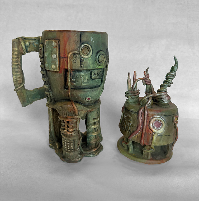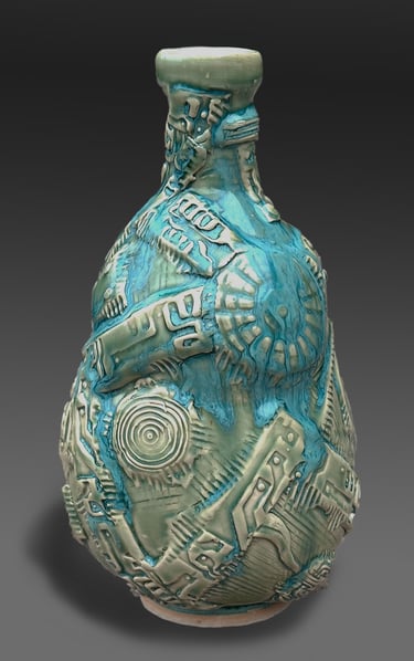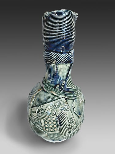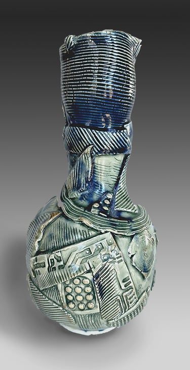 Trained in Fine Arts at Florida State University with a BA in Constructive Design and MFA in Metals, I create sculptural vessel forms inspired by ancient pottery and natural containers. After leaving animation, I began integrating digital tools—3D modeling and 3D-printed textures—with traditional clay processes.
