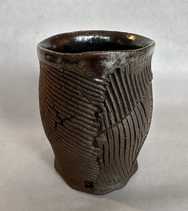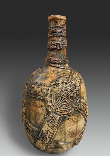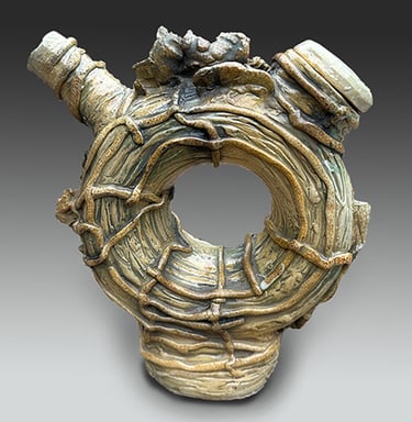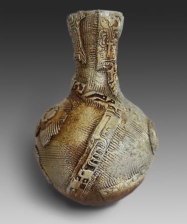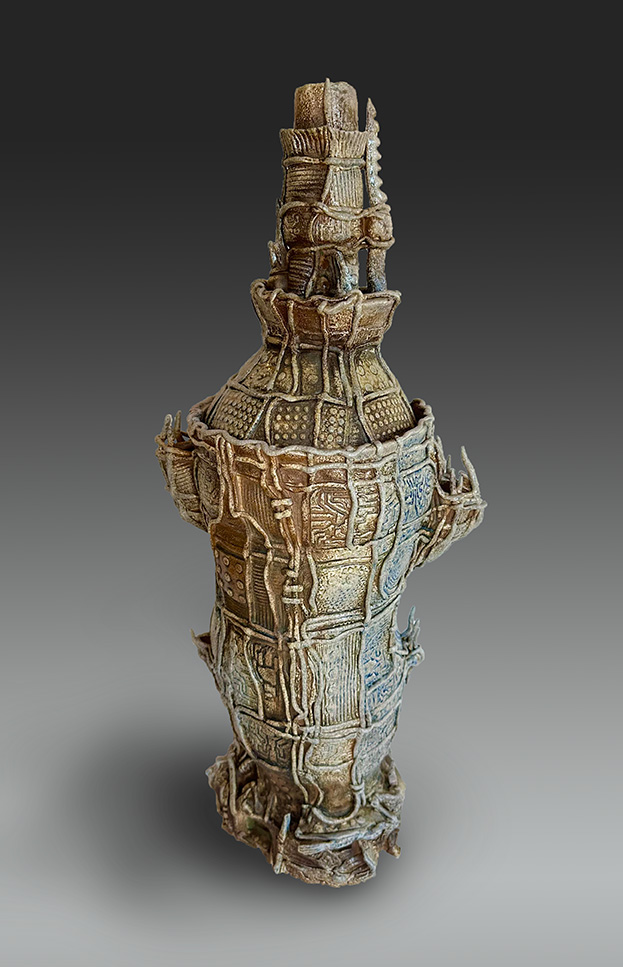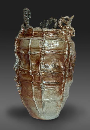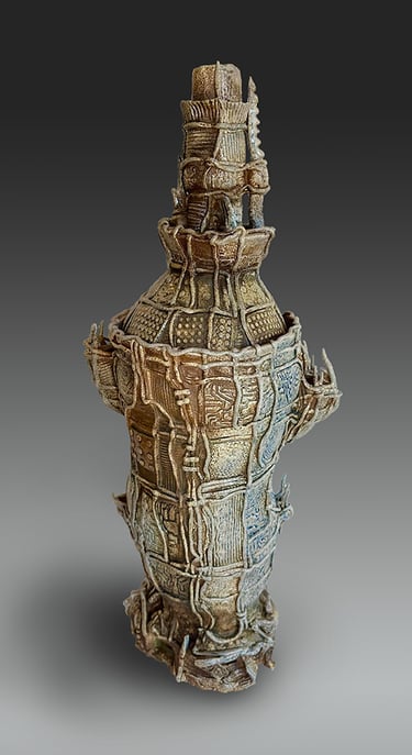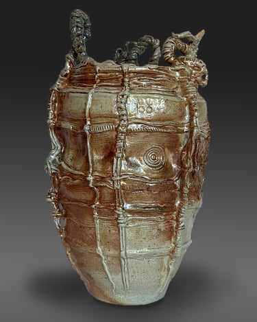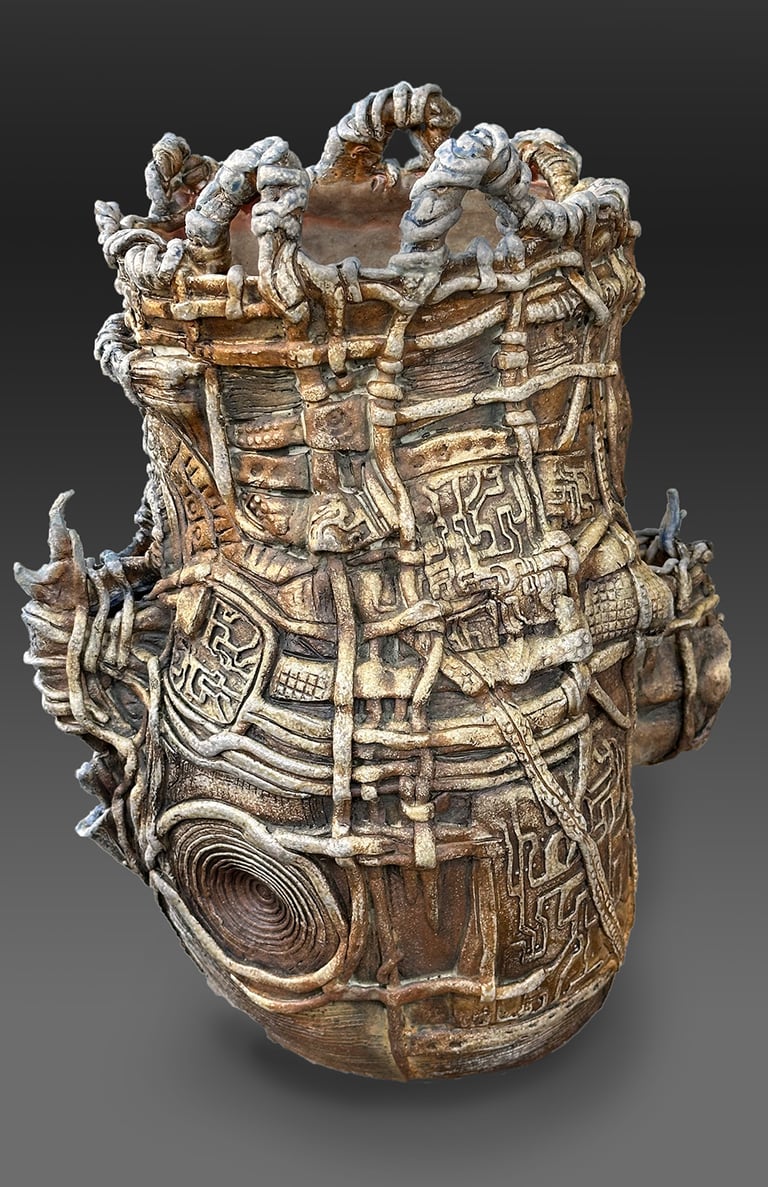 My work is influenced by the Japanese aesthetic of wabi-sabi and uses wood and soda firing, where ash, flame, and kiln placement shape each surface. The resulting vessels read as artifacts from an imagined, alien civilization—objects formed by unknown rituals and technologies, blurring the line between architecture, container, and relic.