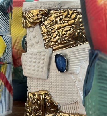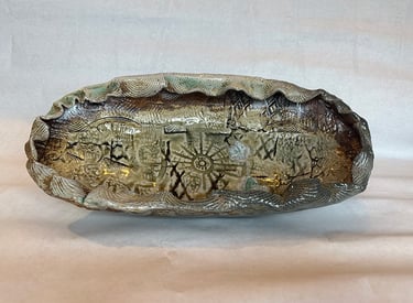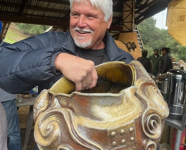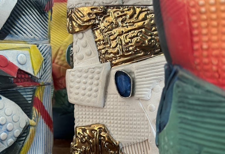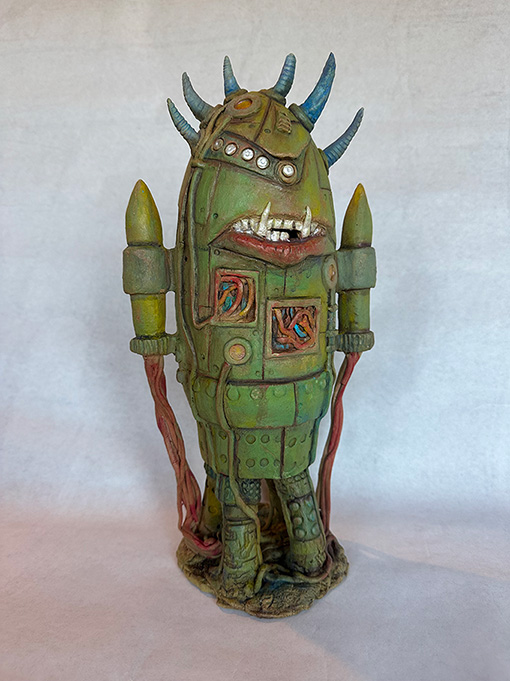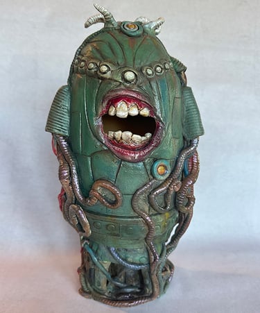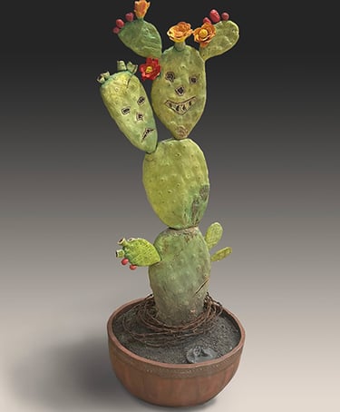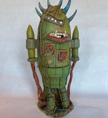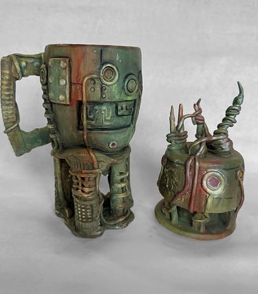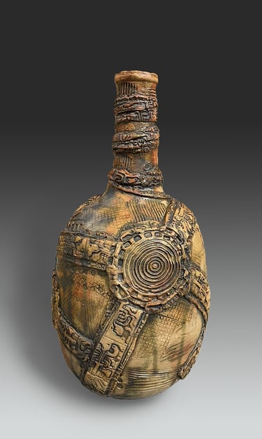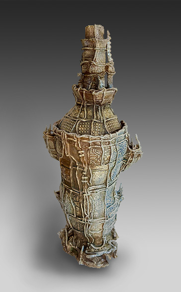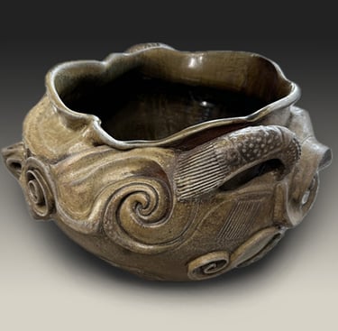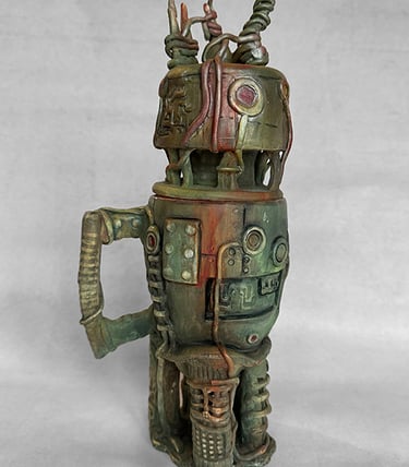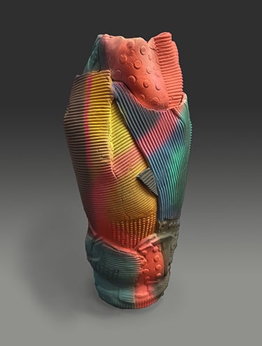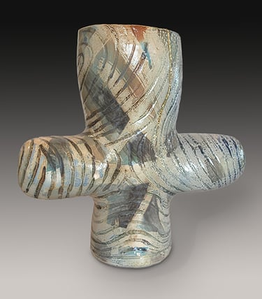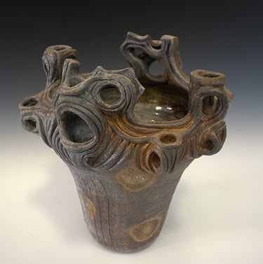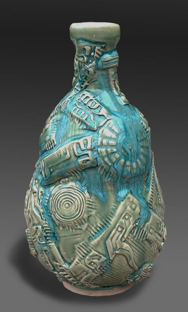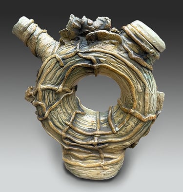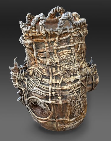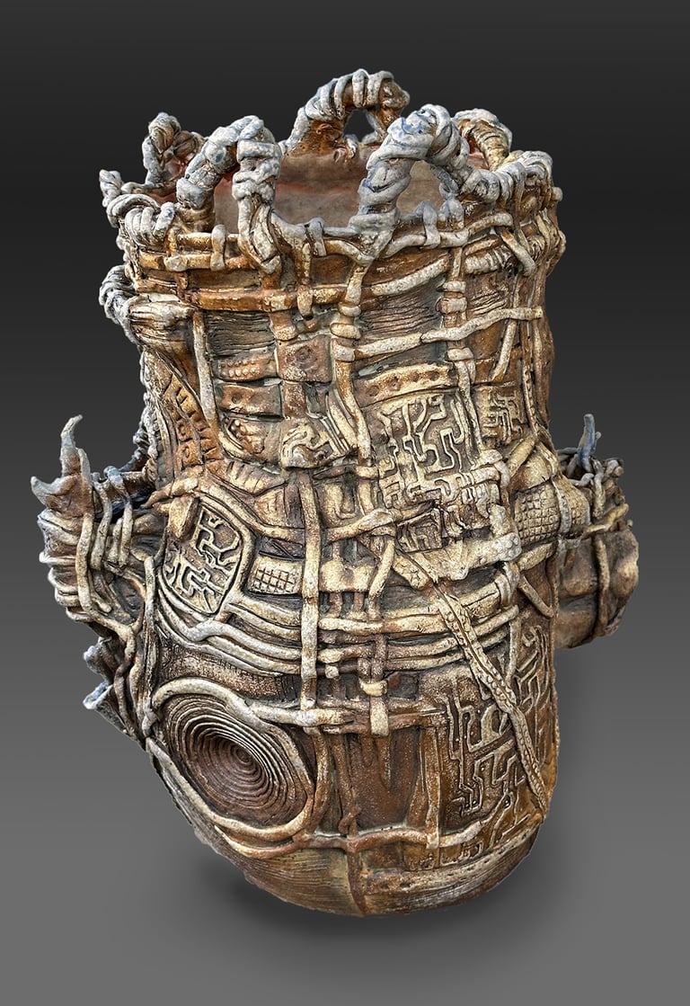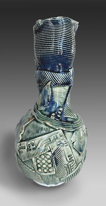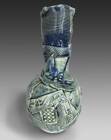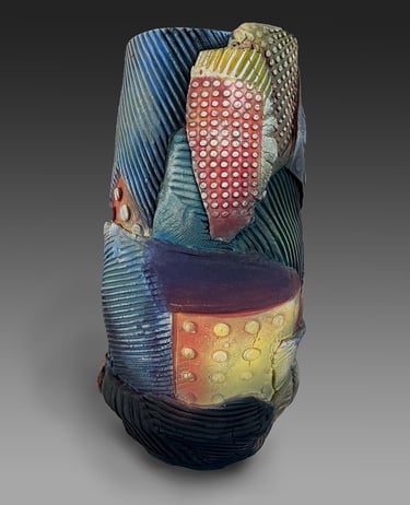 As I pursued my undergraduate degree in Fine Arts at Florida State, my interest shifted towards Sculptural Vessels while studying under William Harper. This journey led me to earn an MFA in Metals. During this period, I took on the role of Assistant Art Director at WFSU TV, which reignited my early love for animation through the creation of commercials and promotional materials. Eventually, I moved to San Diego, California, where I secured a Sabbatical position that allowed me to enter the budding digital animation field. As I advanced in this area, I found myself working at DreamWorks Animation as a surfacing/texture artist until my retirement in 2017. I then merged my digital expertise with 3D printing as I began experimenting with clay. Now, I employ 3D modeling to bring my concepts to life and utilize 3D printed textures to imprint onto clay slabs to form my creations. My experience as an animator has made me conscious of the importance of storytelling in my art. Sometimes, the narrative is evident in movement and energy, or in the aging history of a piece; regardless, I continue to strive for spontaneity in my execution.
